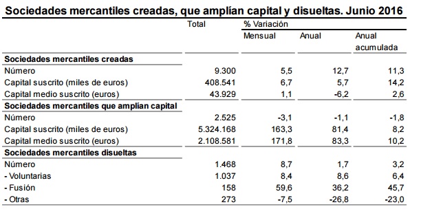 La cifra total de empresas creadas en junio fue de 9.300 sociedades, el 12,7% más que en el mismo mes de 2015, mientras el número de disoluciones fue de 1.468, un 1,7% más, según el INE.