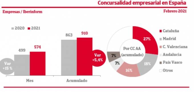 Febrero registró un aumento interanual del 15% de las insolvencias empresariales en España volviendo a marcar una tasa de crecimiento de dos dígitos. En el acumulado de los dos primeros meses del año el incremento alcanza el 5,4%. Tanto España como los mercados de nuestro entorno han adoptado medidas para frenar las declaraciones de quiebra, modificando los umbrales de presentación, reduciendo la capacidad del acreedor para forzar su admisión o proporcionando suficiente apoyo financiero al deudor para retrasar su presentación. En el caso de España, la actual moratoria finalizará el 14 marzo, salvo que se publique una nueva extensión.
