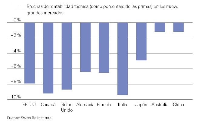 En el seguro mundial existe una considerable brecha de rentabilidad en los principales mercados de No Vida y para cerrarla no es suficiente con mejorar el rendimiento técnico. Hay que ir más allá y lograr que las primas aumenten considerablemente. Según el estudio Sigma de Swiss Re Institute, "los márgenes técnicos necesitan mejorar entre 5 y 9 puntos porcentuales en los principales mercados occidentales y en Japón para ofrecer a los inversores el deseado ROE del 10%".