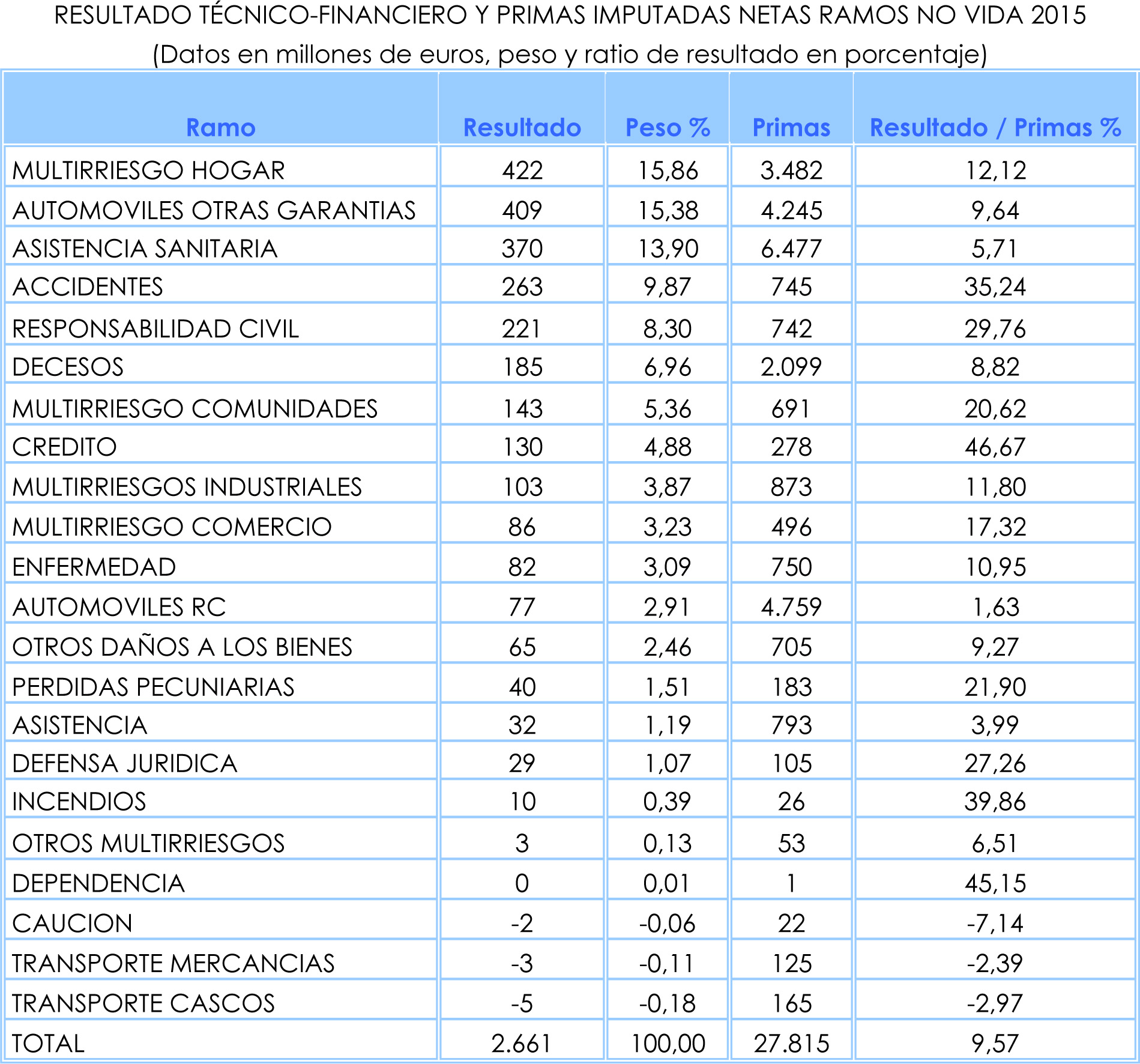 El resultado técnico financiero del ramo de No Vida en 2015 ascendió a 2.661 millones con primas por valor de 27.815 millones, por lo que el ratio de resultados como porcentaje de las primas es del 9,57%. Muy por encima de ese dato de rentabilidad se encuentran los ramos de Crédito, con un 46,67%, Incendios, con un 39,86%, y Accidentes, con un 35,24%. Los tres mejoran respecto a 2014, menos Accidentes, según se desprende de los datos del Informe Anual 2015 de la DGSFP.