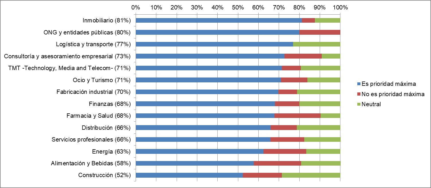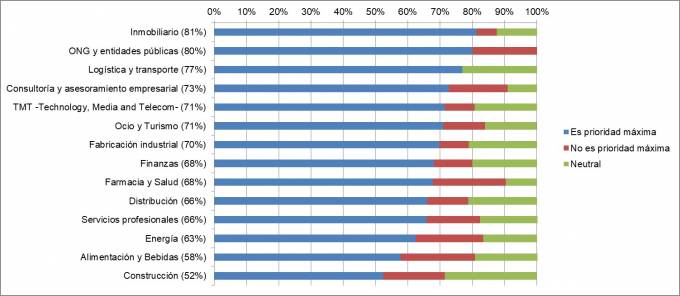 En cuanto a los sectores de actividad más concienciados, en el ranking ocupan el primer lugar las empresas dedicadas al sector inmobiliario, donde el 81% reconoce que garantizar el cumplimiento del RGPD es prioritario en su estrategia. Por el contrario, las compañías de la industria de alimentación y bebidas (58%) y de la construcción (52%) son las menos concienciadas.