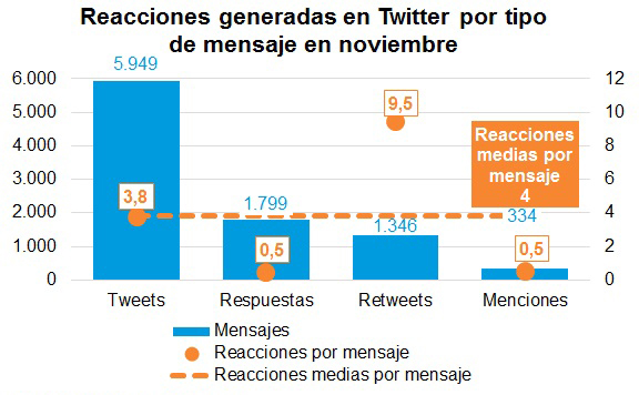 En noviembre, las cuentas de Twitter en español del sector asegurador generaron 9.428 nuevos posts o mensajes (publicaciones en forma de Tweet, Respuesta, Mención o Retweet) que originaron 36.086 nuevas reacciones dentro de la comunidad (respuestas indicando que les gusta (Favoritos), y/o compartiendo con sus seguidores (Retweets)), según los datos de ICEA. Los tweets son el formato más utilizado por las compañías para realizar sus publicaciones, aunque los retweets realizados son los que generan mayores reacciones entre los usuarios.
