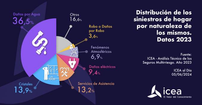 Hasta el 36,5% de los siniestros de seguros de Hogar fueron causados por daños por agua en 2023, según los datos de ICEA. Se situaron muy por delante de los daños de cristales, que registraron el 13,9% del total. Mientras, por importe siniestral, los daños por agua supusieron el 40,1% del total, seguidos de fenómenos atmosféricos el 11,9% y cristales el 10,5%.