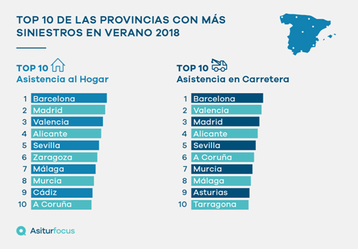 En cuanto a su actividad de asistencia en carretera, lo que más atendió Asitur en verano fueron problemas en las baterías de los vehículos, seguido de averías en el motor y en los neumáticos. De nuevo, Barcelona fue la provincia con más siniestros, por delante de Valencia y Madrid.