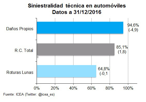A 31 de diciembre de 2016, Daños Propios era la garantía que tenía una siniestralidad técnica más elevada en Autos, alcanzando el 94,6%, 4,9 puntos por debajo del valor del año anterior; seguida por RC, con el 85,1%. Los valores más bajos se dieron en Incendios y Ocupantes, situándose entre el 16% y el 19%, según los datos de ICEA.