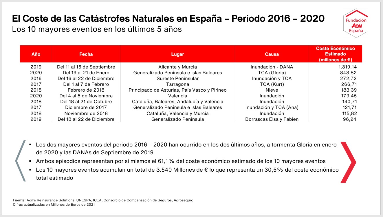 En estos años, el desastre natural con mayor coste económico fue la DANA de septiembre de 2019 en Alicante y Murcia, con 1.319 millones de euros de impacto, seguida del temporal de enero de 2020 en toda la península, con un coste de 843 millones de euros. El temporal Filomena no entra dentro del periodo estudiado, pero el informe dedica un apartado, especificando que su coste económico se elevó hasta los 1.157 millones de euros, de los que 505 millones estaban asegurados.
