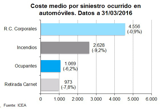 A marzo de 2016, las garantías con costes medios más elevados en Autos fueron las de RC Corporales, con un importe medio de 4.556 euros, un 0,9% menos en tasa anual, seguida de la garantía de Incendios, con un coste medio de 2.628 euros, y un descenso del 9,2%, según los datos de ICEA.