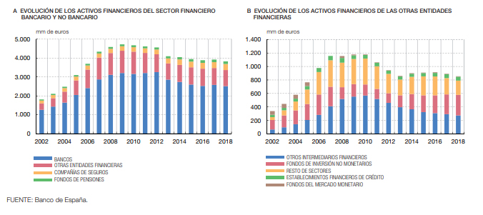 El sector bancario sigue siendo el componente principal del sistema financiero español. Ello, a pesar de la disminución de sus activos financieros después de la crisis económica. De hecho, desde este periodo, únicamente las compañías de seguros y los fondos de pensiones han aumentado su presencia en el sistema español, mientras que el bancario se viene reduciendo desde 2012.