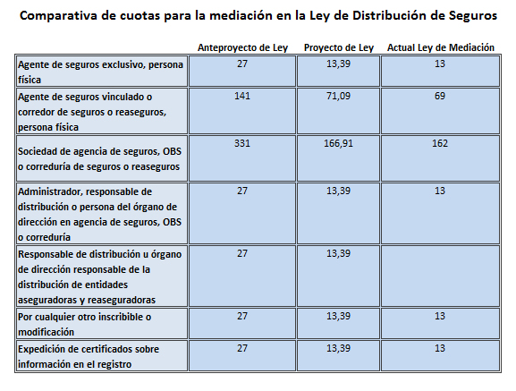 La llamativa variación en ambos textos, realizada sin grandes anuncios, se puede ver de manera clara en elpunto 4 de la disposición adicional cuarta y que habla de la tasa de inscripción en el registro administrativo. Destaca que para las agencias de seguros, OBS y corredurías la cuota haya pasado de 331 euros a algo menos de 167. La cuantía para la inscripción de un agente de seguros vinculado se quedará en 71 euros frente 141 euros que indica la propuesta anterior. Si el agente es exclusivo la cuota fijada será de 13 euros por los 27 anteriores.