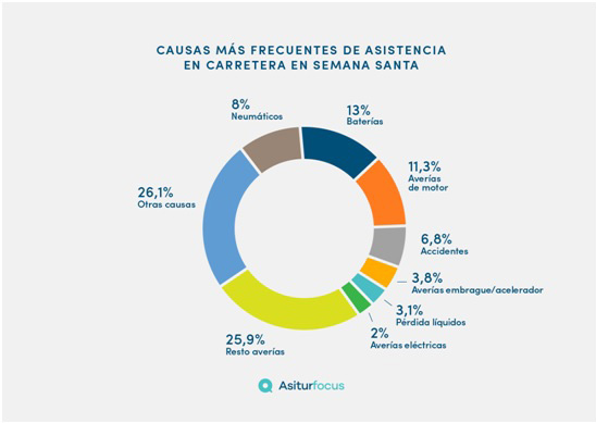 Según este análisis las causas más frecuentes de asistencia en carretera durante la Semana Santa son las baterías (13%) y las averías del motor (11,3%). A estos asuntos le siguen problemas con los neumáticos (8%), accidentes (6,8%), embrague y acelerador y la pérdida de líquidos.