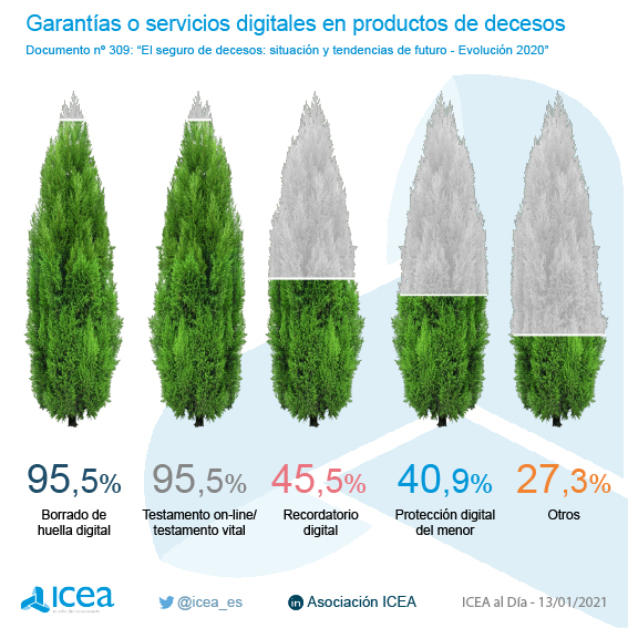 El rejuvenecimiento de las carteras y la atracción de clientes más jóvenes marcan el proceso de digitalización en el seguro de Decesos, en el que las aseguradoras se vuelcan para atender sus requerimientos tanto en coberturas como en formas de contratación. Según los datos de ICEA, las coberturas como "el borrado de la huella digital o la disponibilidad de la formalización de un testamento online son algunas de las que nos podemos encontrar, cada vez de forma más generalizada, en los productos aseguradores de decesos que se encuentran hoy en el mercado".