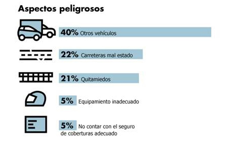 Según un estudio elaborado por Direct Seguros, el 43% de los conductores de motos considera que el mayor peligro que hay en las carreteras españolas son el mal estado del firme y los quitamiedos sin protección para motoristas. Además, 4 de cada 10 encuestados destaca que el mayor peligro que se encuentran al conducir una moto son el resto de vehículos que circulan por la carretera. Y un 5% destaca que no tener la equipación correcta para conducir una moto es el mayor peligro al que se puede enfrentar un motorista.