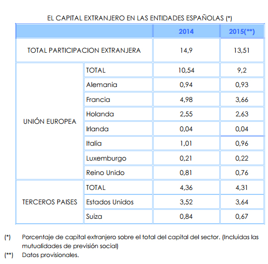 La participación de capital extranjero en entidades españolas procedía en un 9,2% de la Unión Europea (10,54% en 2014) y el 3,64% de Estados Unidos. El importe total de capital suscrito por el capital extranjero en 2015 fue de 1.233 millones de euros frente a 1.408 millones en 2014.