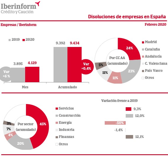 En febrero de 2020, se registraron en España un total de 4.129 disoluciones de empresas, lo que supone un aumento del 6% respecto al mismo mes del año anterior. Sin embargo, en lo que va de año, las estadísticas muestran una mayor estabilidad, con un incremento de apenas el 0,4%, según el último análisis de Iberinform, la filial de Crédito y Caución. Madrid, con el 24% del total de casos, y Cataluña (otro 23%) son las Comunidades Autónomas donde más disoluciones se declaran. Por sectores, predominan las disoluciones de compañías dedicadas a Servicios (45% del total), seguidas por empresas de Construcción (20%) e Industria (7%).