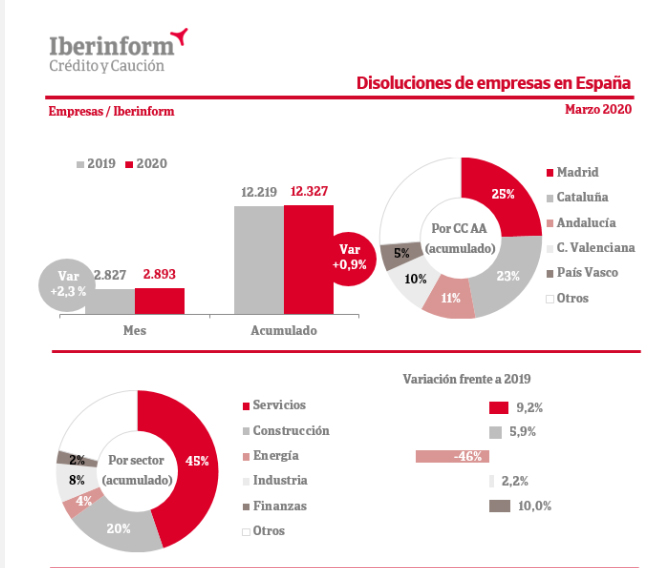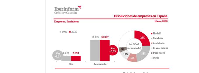 En marzo de 2020, se registraron un total de 2.893 disoluciones de empresas en España, lo que supone un aumento del 2,3% respecto al mismo mes del año anterior, según un análisis de Iberinform, filial de Crédito y Caución. Esta tendencia cambia si se analiza el conjunto del año, que experimenta un incremento del 0,9%.