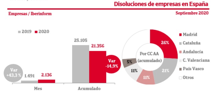 Las disoluciones de empresas han crecido un 43% en el mes de septiembre según los datos de Iberinform (2.136 disoluciones). En el acumulado del año, las disoluciones muestran una disminución de un 15%. Madrid (26% del total de casos) y Cataluña (otro 21%) son las Comunidades Autónomas donde más disoluciones se declaran. Les siguen Andalucía (11%) y Comunidad Valenciana (11%). Por sectores, predominan las disoluciones de compañías dedicadas a Servicios (44% del total), seguidas por empresas de Construcción (21%) e Industria (8%).