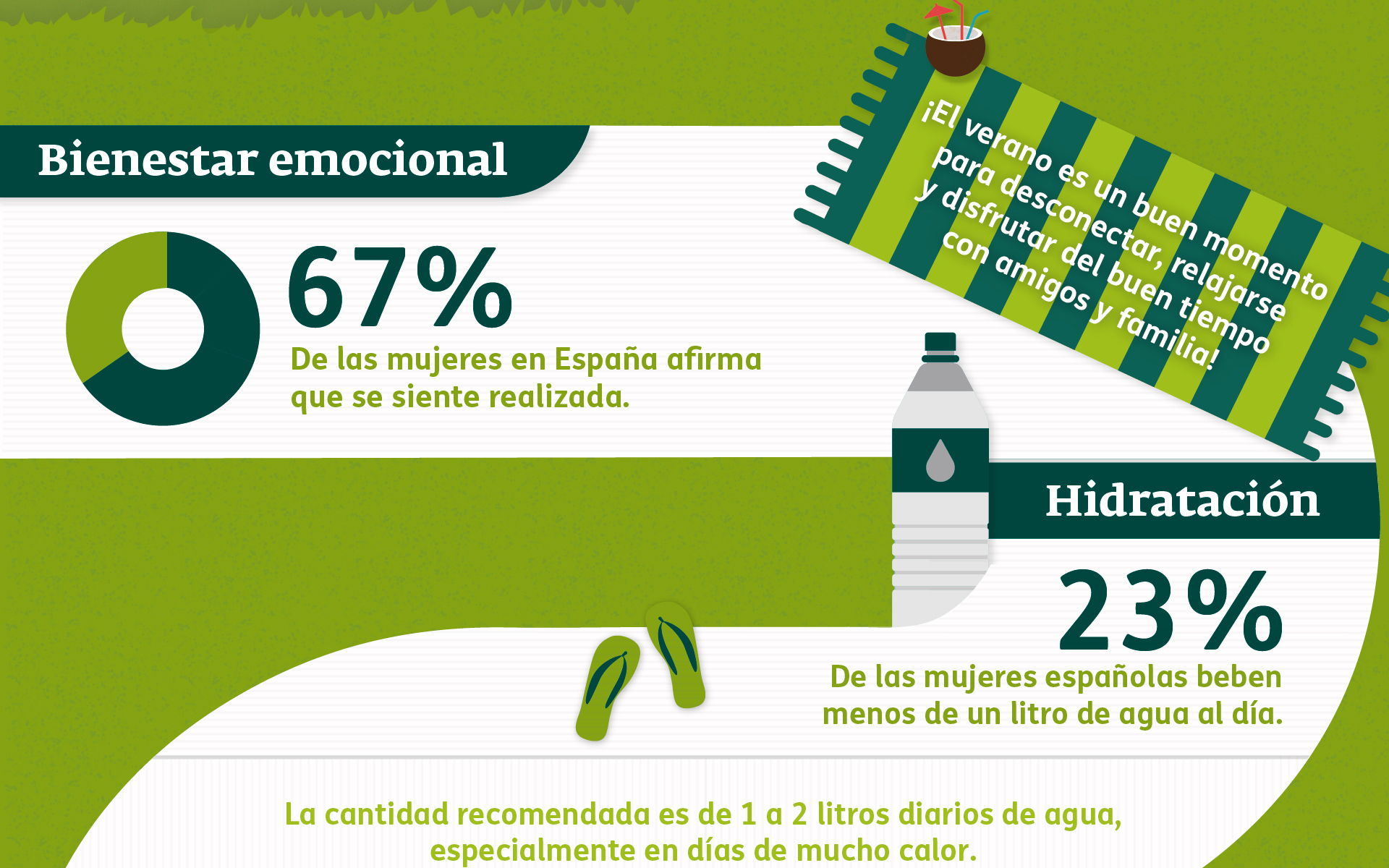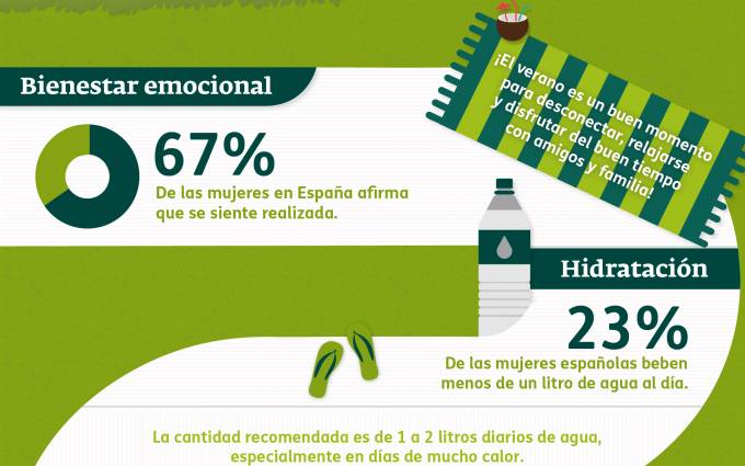En primer lugar, la aseguradora aconseja cuidar el bienestar emocional e hidratarse. En relación a este último aspecto, el 23% de las mujeres españolas afirman que beben menos de un litro de agua al día, cuando la cantidad recomendada es entre uno y dos litros, especialmente en periodos de mucho calor.