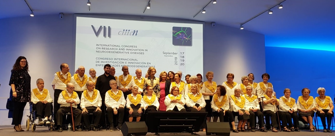 La Reina Doña Sofía apoyó con su presencia al coro Les Veus de la Memòria patrocinado por Divina Pastora en su actuación con motivo de la clausura del simposio 'La investigación sociosanitaria en la enfermedad de Alzheimer y otras demencias'. Al término de la actuación, la Reina subió a felicitarles, saludó a cada uno de los integrantes de este coro y charló con ellos.