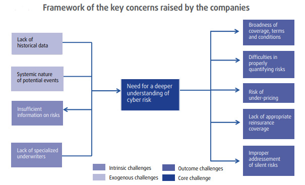 Eiopa comenta que con "el mercado de ciberseguros localizado predominantemente en EEUU y solo una fracción del total en Europa, los informes disponibles y análisis se centran en el mercado global o en el estadounidense. Hasta ahora se ha prestado muy poca atención al mercado europeo. El estudio confirma este hecho, concretamente la necesidad de una más profunda comprensión de los ciberriesgos, que son un desafío clave para la industria aseguradora europea". Este desafío genera o alimenta a su vez otros desafíos, como el inapropiado tratamiento de los riesgos 'no afirmativos' o riesgos 'silenciosos' (estos riesgos se refieren a los casos en los que la ciber exposición no está explícitamente incluida ni excluida en la póliza) y las dificultades para cuantificar los riesgos, entre otros, según explica Eiopa.