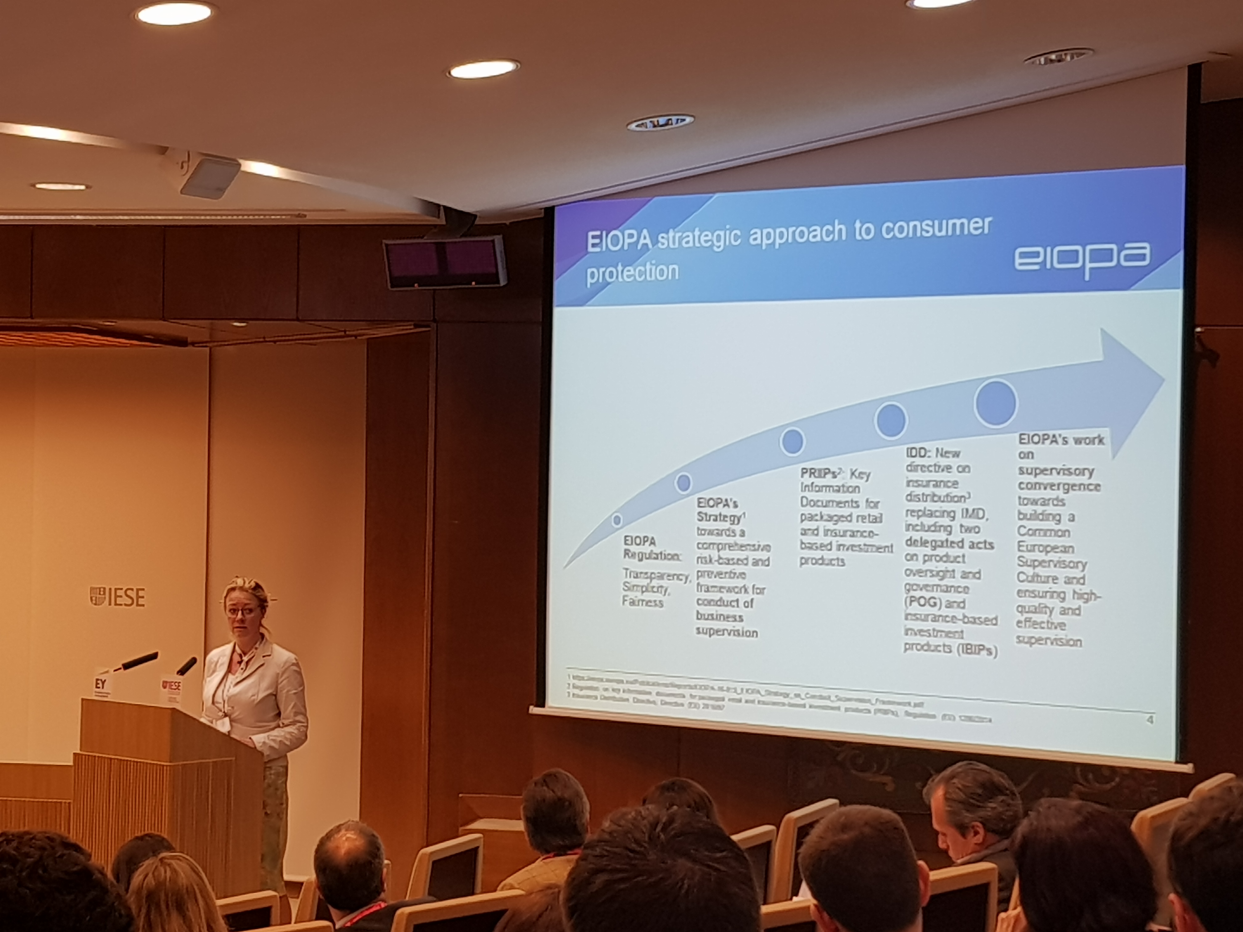 En el encuentro de seguros del IESE destacó que el regulador busca implementar una normativa neutra en cuestiones de tecnología. Indicó que estas nuevas realidades del mercado suponen "muchas oportunidades, pero también preocupación para el sector y los consumidores". Indicó que el ir hacia nuevos productos, personalizados y específicos es parte de la innovación que es "fundamental", pero Eiopa espera también una reducción de las primas.