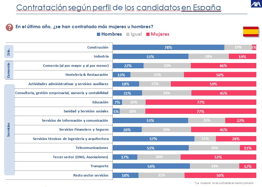 El sector de los servicios financieros y seguros, tradicionalmente un coto reservado a los hombres, comienza feminizarse. En el último año, en el 45% de los casos, las empresas se han inclinado por contratar más mujeres, frente a un 20% de las compañías que han fichado más hombres. El resto declara haberlo hecho aproximadamente igual. Este es uno de los datos más llamativos del informe 'Necesidades Laborales de las Empresas' que han presentado conjuntamente GAD3, Educa20.20 y la Fundación AXA en la Cámara de Comercio de Madrid.