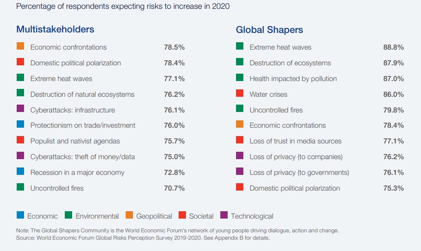 De los más de 750 expertos consultados, el 78% espera que las confrontaciones económicas y la polarización política interna aumenten en 2020. Esto sería catastrófico, en concreto para abordar los desafíos urgentes como la crisis climática, la pérdida de biodiversidad y la disminución récord de las especies.