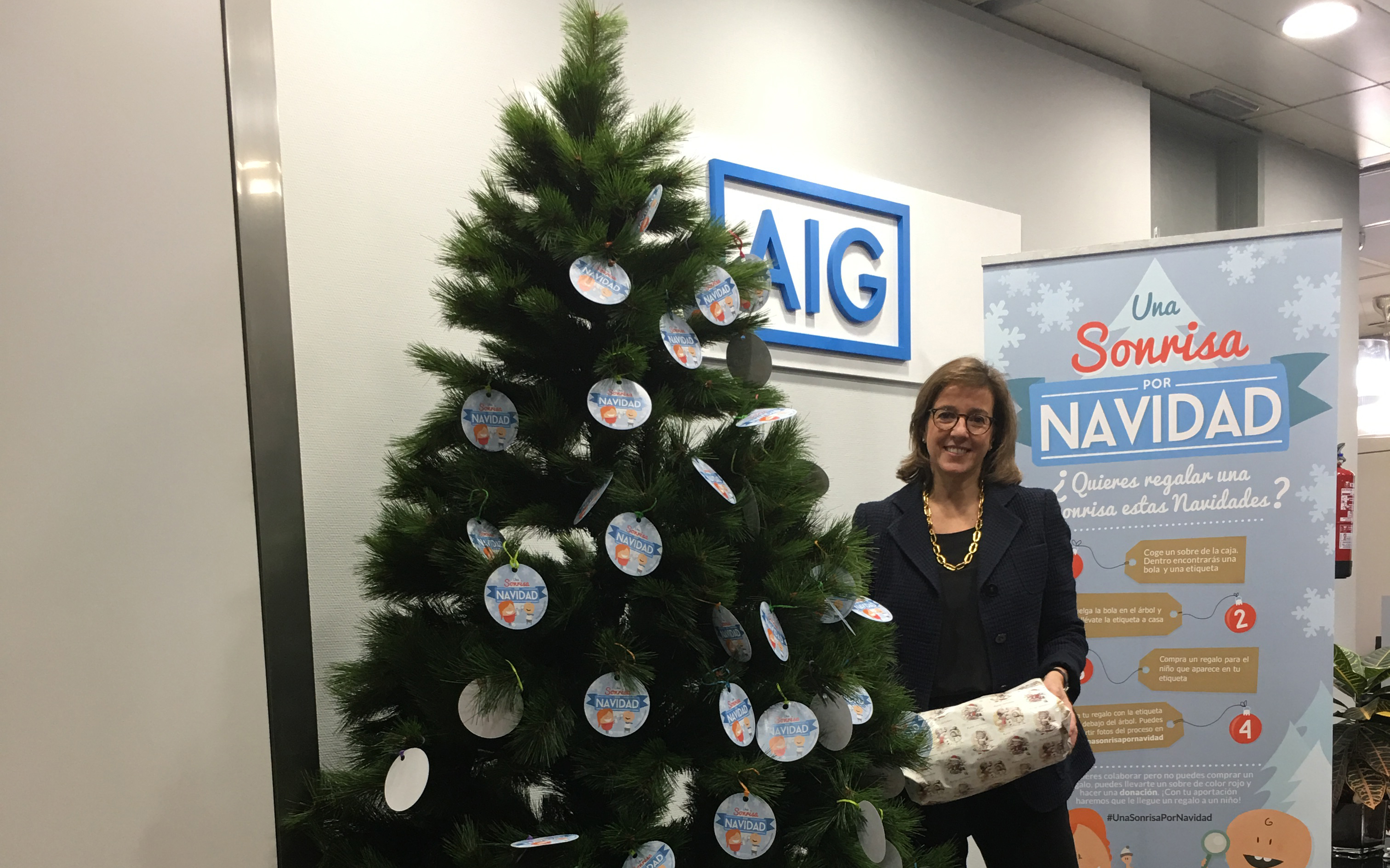 Un año más, los empleados de AIG han participado en la campaña solidaria 'Una sonrisa por Navidad', organizada por la ONG Cooperación Internacional. El objetivo de esta iniciativa era conseguir regalos para niños de familias desfavorecidas. Para ello, la ONG colocó un árbol de Navidad en las oficinas de la aseguradora en Madrid y, junto a él, una caja con sobres azules y rojos. Cada sobre contenía una bola decorativa y un tarjetón, bien para realizar una donación económica o bien con el nombre y edad de un niño o niña. Si se elegía el sobre azul, había que comprar un regalo, colocarlo al pie del árbol y colgar la bolita en el abeto. Si se optaba por el sobre rojo, había que colgar la bola y realizar una donación económica para la campaña. Cooperación Internacional se ha encargado de recoger todos los regalos y hacérselos llegar a los menores.