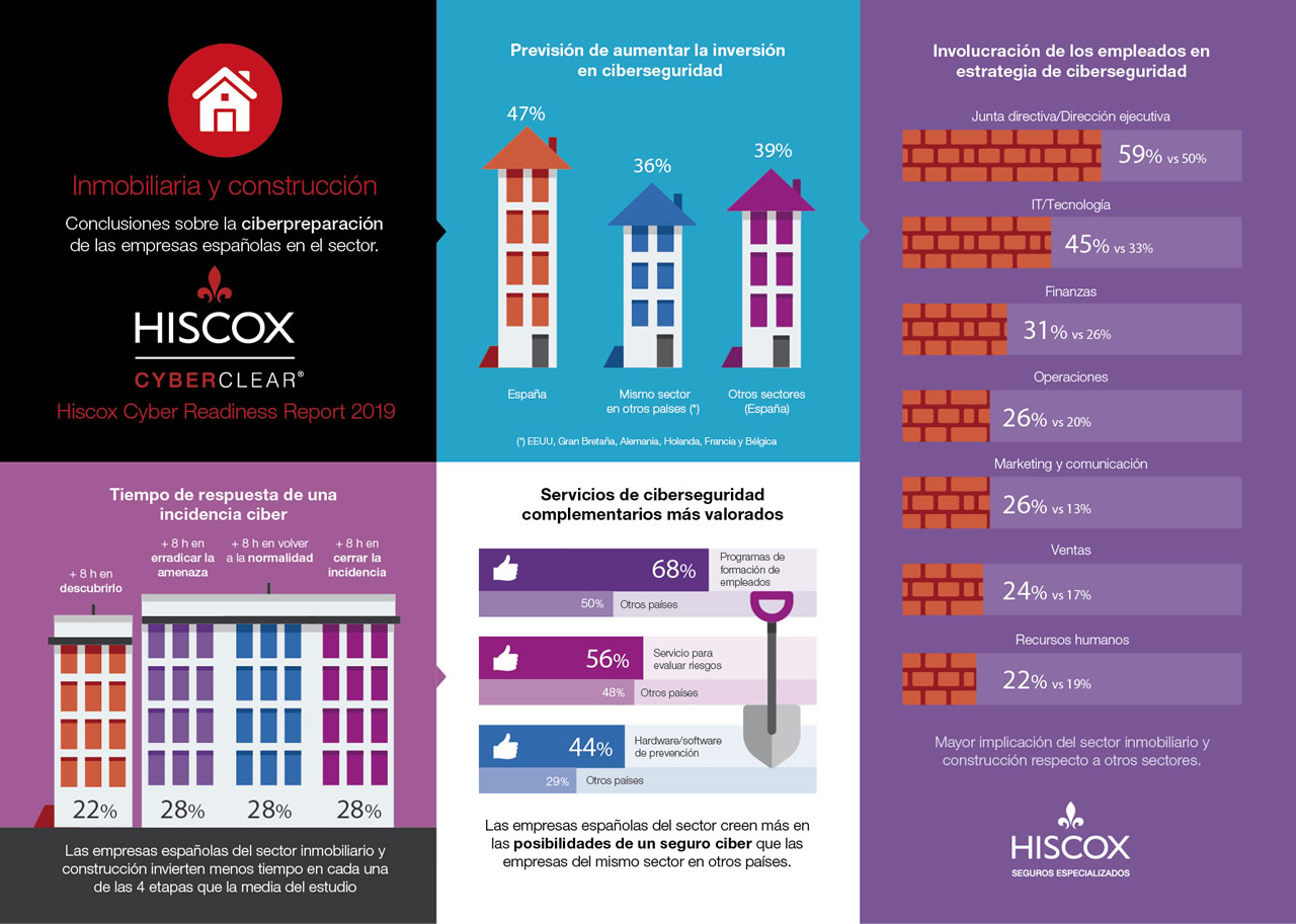Son datos del estudio de ciberpreparación de Hiscox, 'Hiscox Cyber Readiness Report 2019', que colocan a las compañías españolas inmobiliarias y de construcción por delante de otros sectores (39%), y además 11 puntos por encima de la media de compañías del mismo sector en otros países (36%).