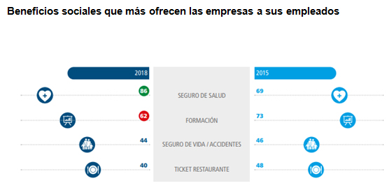 En línea con esta afirmación, el seguro de Salud es, con diferencia, el beneficio social más ofertado por las organizaciones. El 86% de las mismas lo ofrecen frente al 69% de 2015. Le sigue a distancia formación (62%) y los seguros de Vida y Accidentes (44%). Y entre las empresas que no ofrecen este seguro, el 45% tiene intención de hacerlo.