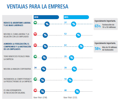 Estos datos están en línea con el hecho de que el 91% de las empresas valoran la importancia de ofrecer un seguro de Salud a sus trabajadores y el mismo porcentaje considera que los empleados comparten su visión sobre la relevancia del seguro de Salud, especialmente las empresas de mayor tamaño (97%). Los beneficios que ven las organizaciones al ofrecer estos seguros a sus empleados son varios: habla bien de la empresa, demuestra que está avanzada socialmente (90%), que se preocupa por sus empleados y bienestar (88%), que la hace más atractiva para reclutar nuevos empleados (82%), y que la diferencia del resto de compañías (81%)
