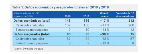 Es cierto que la razón que esgrime el informe sobre el descenso económico es el registro de menos huracanes en Estados Unidos, pero aun así, hasta diciembre se contabilizaron unos daños globales de 146.000 millones de dólares frente a los 176.000 de un año antes, lo que implica una mejora del 17% en relación a 2018 y muy por debajo de los 212.000 millones que promedia la última década.
