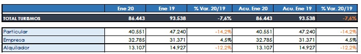 El canal de particulares registra un descenso del 14,2%, hasta las 40.551 unidades. Este canal mantiene su tendencia negativa acumulando ya 16 meses de caídas en las matriculaciones (con la sola excepción de septiembre de 2019) y sin que parezca existir ninguna razón para revertir esta tendencia. Empresas, por su parte, es el único canal que logra incrementar sus ventas en un 4,5%, hasta las 32.785 unidades. El canal de alquiladores también rebaja sus compras en un 12,2%, hasta las 13.107 unidades entregadas en enero.