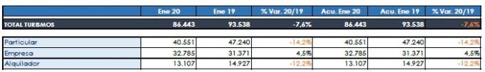 Las matriculaciones de turismos y todoterrenos volvieron a descender en el mes de enero un 7,6% hasta las 86.443 unidades, con el canal de particulares encadenando ya 16 meses de caídas consecutivas, aunque todos los canales redujeron ventas, según datos facilitados por Anfac.
