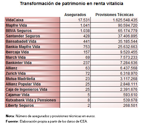 Según los datos detallados que proporciona ICEA, de 57 entidades individuales (de un total de 69 que operan en Vida), que en su conjunto acaparan el 97,4% de las reservas matemáticas de todo el sector derivadas de la transformación de patrimonio en renta vitalicia, solo un tercio gestiona ahorro procedente de estas operaciones (17 entidades de 57).