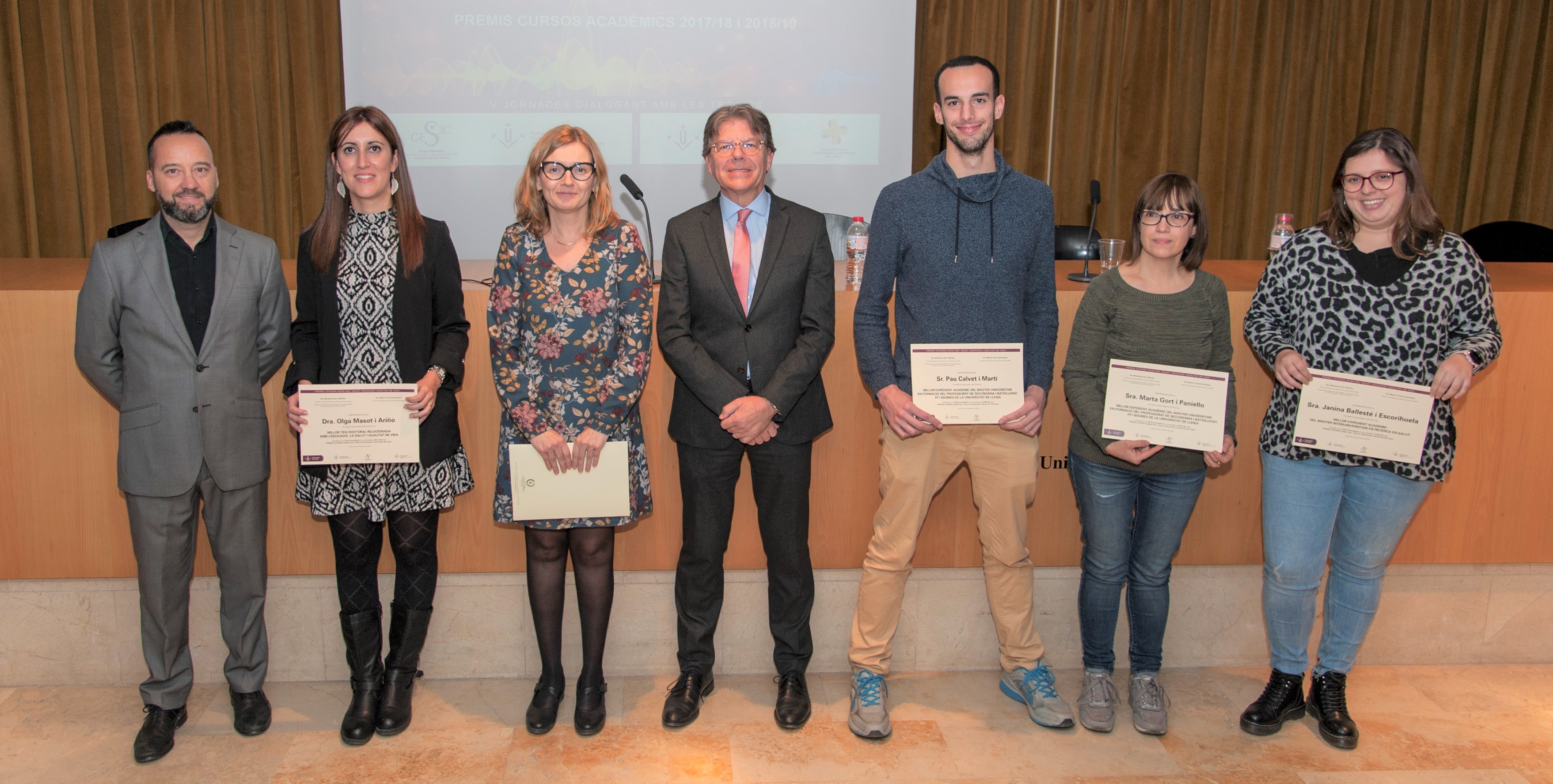 La Cátedra también ha entregado las ayudas a la investigación y la promoción de la excelencia, cuyo objetivo es favorecer la formación en másteres oficiales de los estudiantes con mejor expediente. Las ayudas a la promoción de la excelencia del Máster en Formación del Profesorado de Secundaria y Bachillerato, FP e Idiomas que imparte la Facultad de Educación, Psicología y Trabajo social de la UdL, han recaído en los alumnos con mejor expediente académico en los cursos 2017-18, Laia Llubes y Alberto Almenta; y 2018-2019, Marta Gort y Pau Calvet. Igualmente, Janina Ballesté y Laia Llubes han recibido el premio del Máster Interuniversitario en Investigación en Salud de la Facultad de Enfermería y Fisioterapia, por mejor expediente académico del curso 2018-2019.