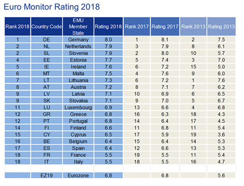 En términos generales, y según este informe, la zona euro se encuentra en buena forma. Ha obtenido una valoración de 6,8 puntos, igual que el año pasado. La última vez que la zona euro obtuvo una puntuación tan alta fue en 2001. Se ha beneficiado de la reducción del desempleo y de la tendencia positiva en las finanzas públicas de todos los países. Si bien, preocupa significativamente el futuro de Italia y Francia, que ocupan las 2 últimas posiciones del ranking. Y también inquieta España, por la pronunciada caída de este año, y Alemania, aunque sigue liderando el ranking. "Desde una perspectiva de país, son las cuatro economías más grandes de la zona euro las que generan especial preocupación, aunque por diferentes motivos", señala Michael Heise, economista jefe de Allianz.