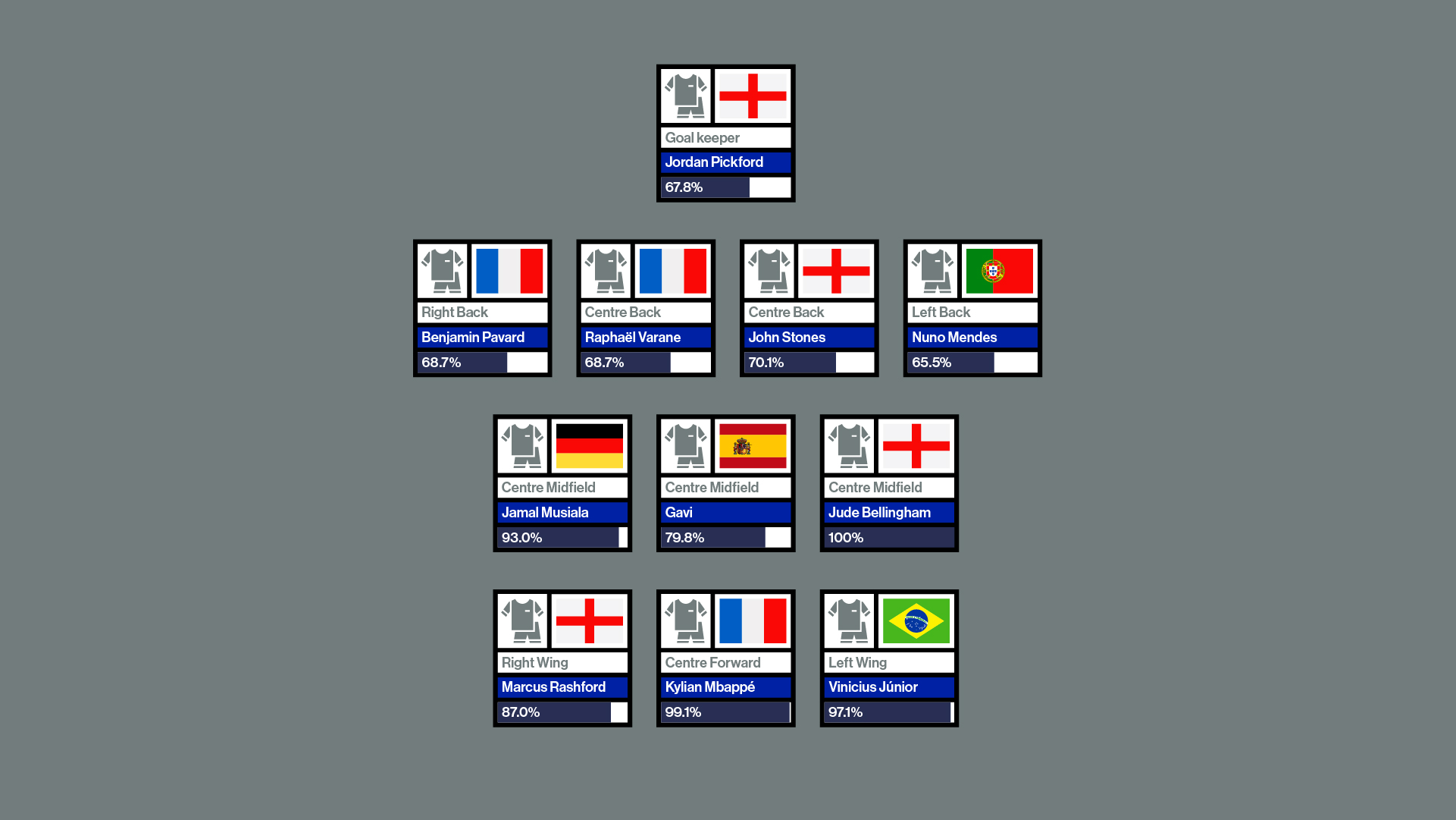 el español del FC Barcelona, Gavi. El jugador más destacado es el inglés Jude Bellingham, seguido del francés Kylian Mbappé y del brasileño Vinicius Junior.