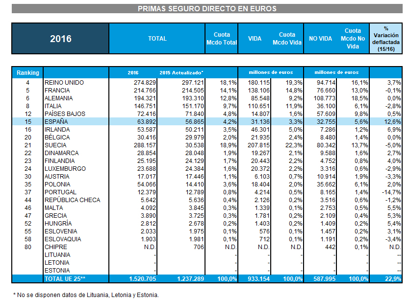 La zona Euro 25 supone el 16% del seguro mundial y en 2016 experimentó un crecimiento del 22,9% en primas. El mayor crecimiento lo obtuvo China con un 25%, el 9,9% de cuota y tercer país en volumen de primas. Estados Unidos ocupa el primer puesto con primas que crecieron un 1,3% que suponen casi el 29% de la cuota de mercado mundial. Japón está a su lado en el ranking y el pasado año sus primas decrecieron un 5%. El seguro en conjunto avanzó el pasado año un 3,1%.