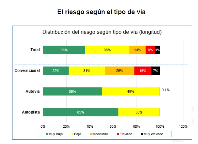 El informe señala la diferencia de riesgo entre vías convencionales y autovías o autopistas. El 22% de los kilómetros de las vías convencionales de calzada única tienen un riesgo 'elevado' o 'muy elevado' de accidente. En cambio, las autopistas son las carreteras más seguras: el 65% de la red tiene un índice de riesgo de accidentalidad 'muy bajo' y las autovías también presentan un riesgo 'muy bajo' (50% de la red).