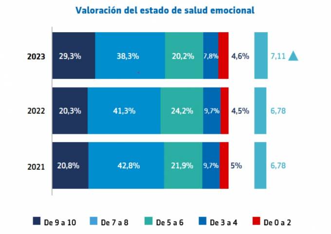 Destaca el incremento en el número de personas que consideran tener una excelente salud emocional, que representan casi al 30% de la muestra (8,8 puntos porcentuales más que el año pasado).