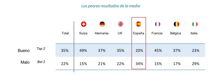 En comparación con el resto de países europeos, España muestra el mayor porcentaje de personas que se encuentran mal o muy mal; mientras que Suiza mantiene las tasas de personas en mejor situación emocional, seguida de Francia y Alemania.