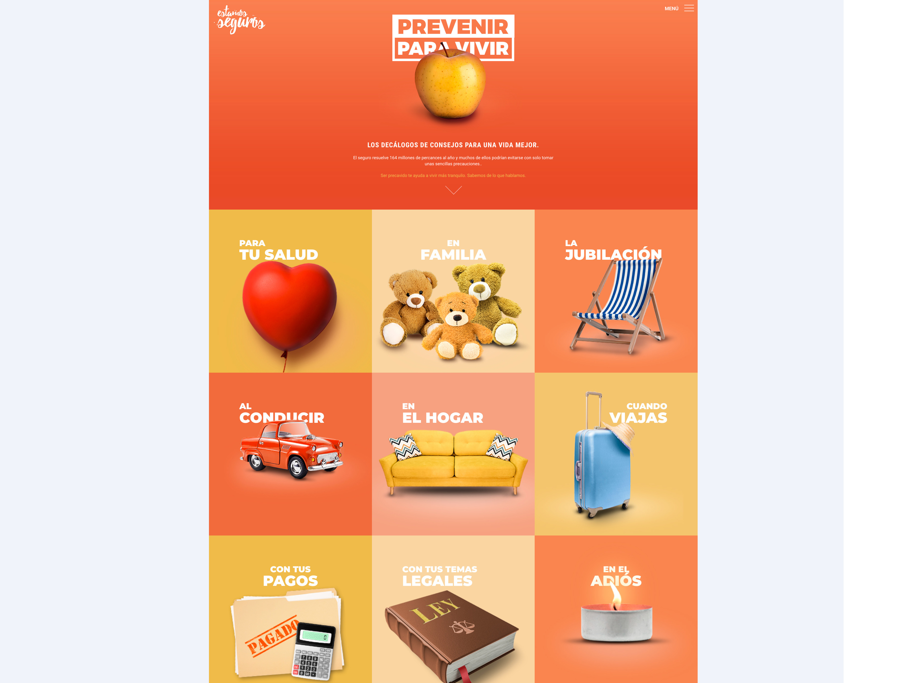 El site se divide en 9 áreas: salud, familia, jubilación, hogar, seguridad vial, viajes, pagos, temas legales y el adiós. En cada una de las áreas se ofrecen sencillos consejos sobre el tema en cuestión y un décimo consejo que se repite en todos los casos: "acude al seguro". Entre los consejos de salud encontramos por ejemplo la recomendación de seguir una dieta equilibrada o no automedicarse; en el área de jubilación se anima informarse y comparar, así como a tener en cuenta el riesgo al invertir los ahorros o diversificar; sobre viajes, 'Prevenir para vivir' aconseja no perder de vista nuestro equipaje o conocer la situación política, legislación, clima y costumbres más habituales de nuestro destino.