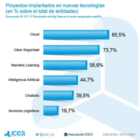 ICEA ha facilitado algunas conclusiones del VI Termómetro del Big Data en el sector asegurador español. Entre ellas, ha revelado cuáles son las tecnologías que más han implantado las aseguradoras. El Cloud es la de mayor implantación hasta la fecha, según han confirmado el 85,5% de los encuestados. Y por detrás se encuentran la Ciberseguridad (73,7%) y el Machine Learning (56,6%).