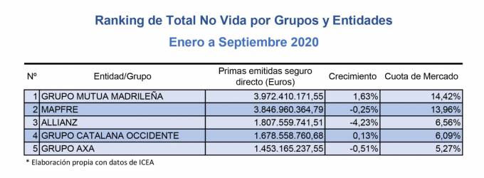 Estos grupos lideran los ranking No Vida del seguro español hasta septiembre