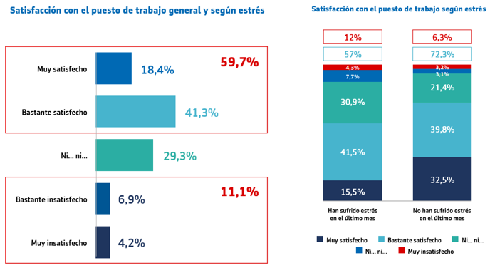 Si bien, los autores del estudio observan una relación directa entre la satisfacción laboral y el hecho de haber sufrido estrés recientemente. De hecho, se verifica que las personas que no se han sentido estresadas están más satisfechas con su puesto de trabajo en un 72,3% de los casos.