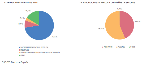Las exposiciones de los bancos a las denominadas Otras Instituciones Financieras (OIF) se llevan a cabo principalmente a través de valores de renta fija, mientras que en compañías de seguros predomina la tenencia de acciones.