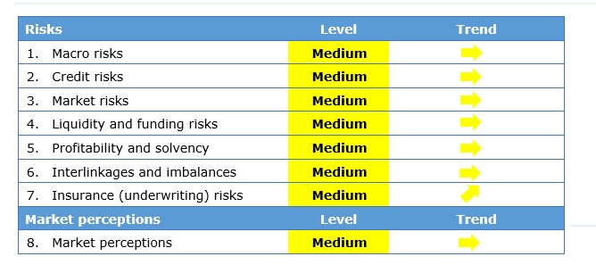 Los riesgos macro continúan a nivel medio. Continúan los tipos de interés bajos, las revisiones de los PIB también siguen a la baja y los pronósticos de inflación en nivel preocupante. Los riesgos de rentabilidad y solvencia también se mantienen estables, con indicadores generales de rentabilidad sin cambios en comparación con la segunda mitad de 2018 y finales de 2017.