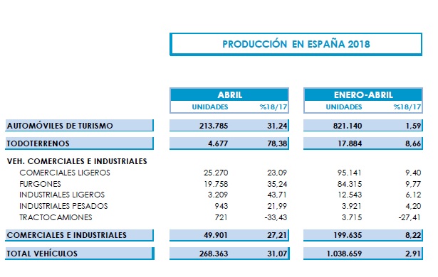 En el primer cuatrimestre de 2018 se fabricaron en España 1.038.659 vehículos, un 2,9% más que en los mismos meses de 2017. Por tipo de vehículo, entre enero y abril se fabricaron 821.140 turismos, un 1,5% más que en idéntico cuatrimestre de 2017. En cuanto a vehículos comerciales e industriales, la fabricación acumulada en los cuatro primeros meses de 2018 también arroja un balance positivo: subida del 8,2% y un total de 199.635 unidades.