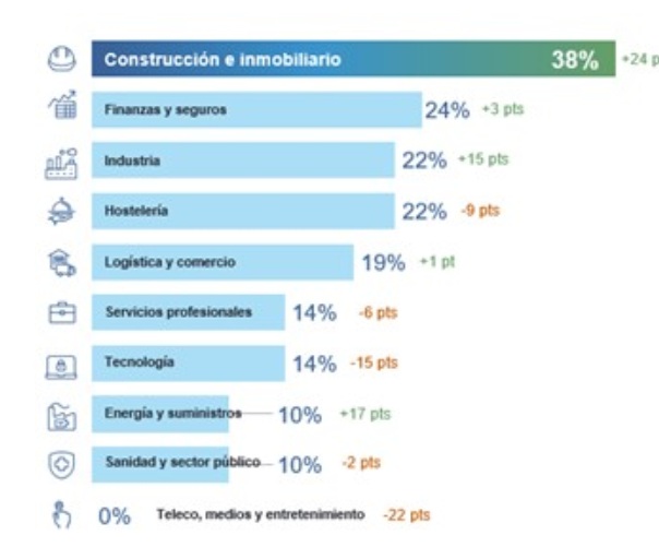 Finanzas y seguros ocupa el 2º puesto en el ranking de creación de empleo, solo por detrás de Construcción e inmobiliario con un 38% de previsiones de contratación, tras un incremento de 24 puntos respecto al trimestre anterior. En tercera posición se sitúan Industria y Hostelería, ambos con un 22%.