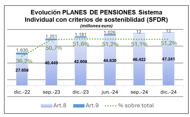 Por otra parte, Inverco ha destacado que al cierre del pasado año el patrimonio de Planes de Pensiones Individuales declarados como artículo 8 ó 9 registró 47.253 millones de euros, lo que supone más del 51% del total (36% en 2022). Añade que existen más de 4 millones de cuentas de partícipes que ahorran para su futuro en planes con criterios sostenibles.